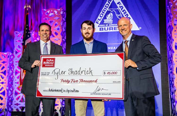 Photo caption: Tyler Shadrick (middle) was named the 2025 Florida Farm Bureau Federation Achievement in Agriculture award winner. The award was presented by Florida Farm Bureau President Jeb Smith and Frank Blossom of Southern Farm Bureau Life Insurance Company at the organization’s 84th state annual meeting in Daytona Beach on Oct. 27. -Photo: Florida Farm Bureau