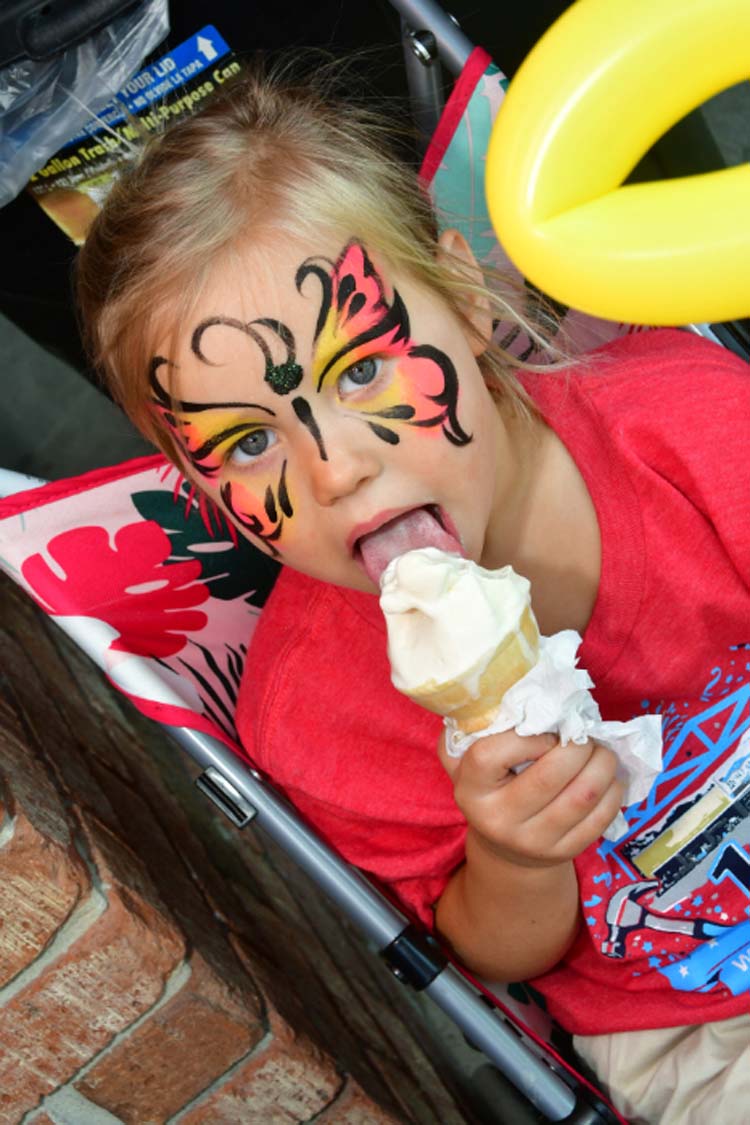 A child enjoying her freshly painted face and a legendary hand-dipped Howland’s ice cream cone during their 100th Anniversary Party.