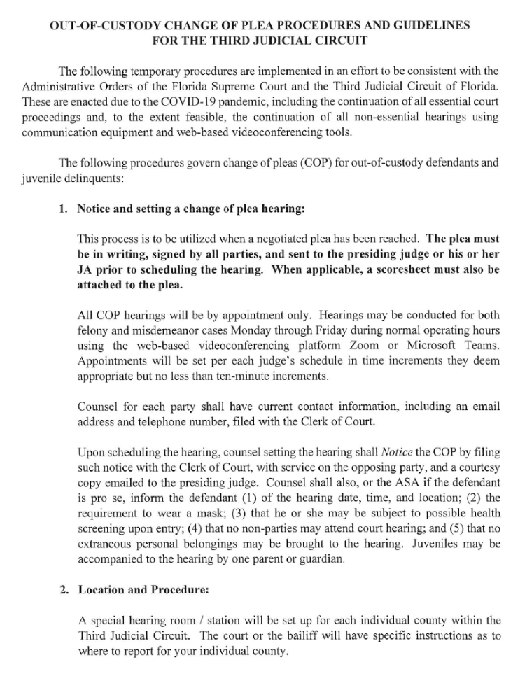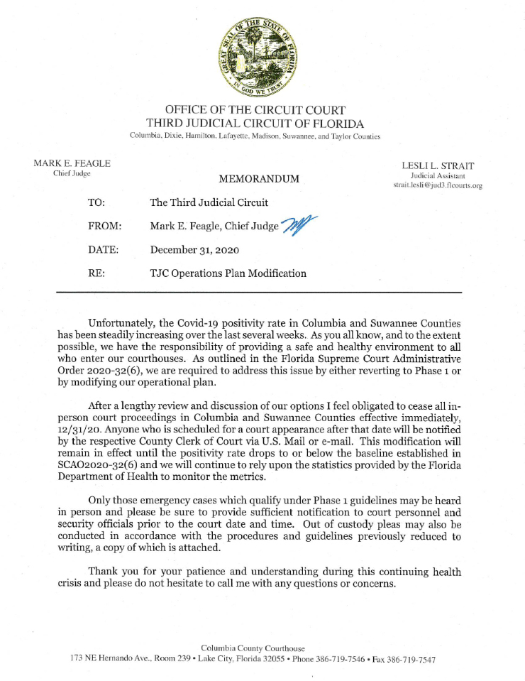Chief Justice Mark E. Feagle announced today there will be a cessation of all in-person proceedings in Columbia and Suwannee Counties effective 12/31/20 due to the increasing COVID-19 infection rate. Please see the letter below in its entirety.