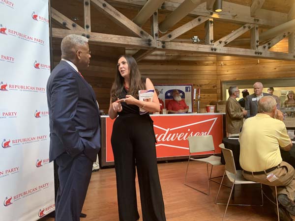 Jamie Siegmeister (right) and Colonel Allen West take a moment to talk during the GOP fundraiser event at Camp Weed. -Photo by Jeffry Boatright