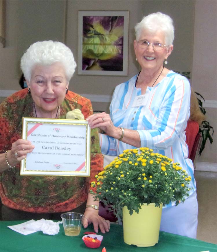 On September 17, we started out our year with a bang. Our President, Shirley Reaves, presented to our long-time Garden Club Member, Carol Beasley, an Honorary Membership Award. Since 2007, Carol has given her spark and energy to make a success of every Garden Club project. She is a true friend to each of us and a great asset to the Club.