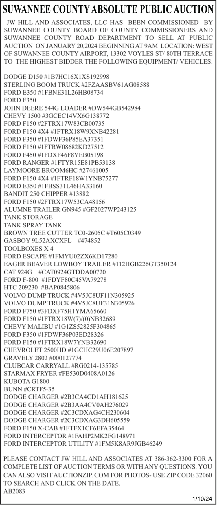 Suwannee County Absolute Public Auction, January 20, 2024