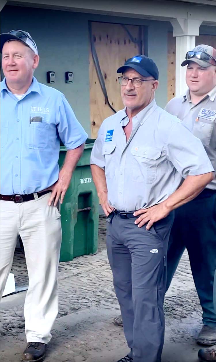 Jim Cantore, center, talks with UF/IFAS personnel during a cleanup of Cedar Key. -Photo: UF-IFAS