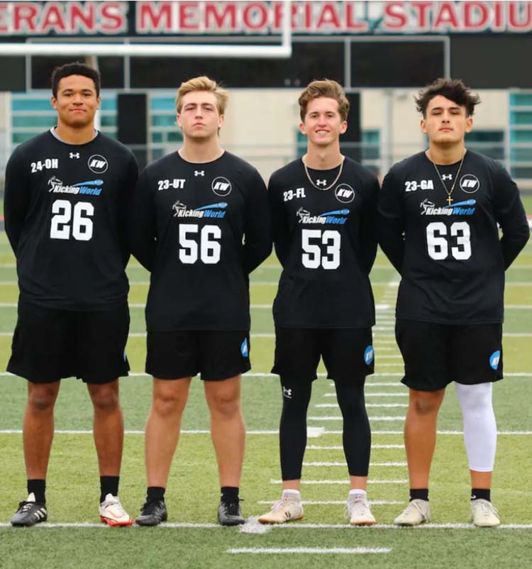 Day 1 FG Overall Winner (Tie) & Runner-up (Tie) at the Kicking World 2022 National Showcase in Austin, Texas. L to R – Derek Morris, Dax Iverson, Braxtyn Green, Ashton Paredes.A-Photo: kickingworld.com