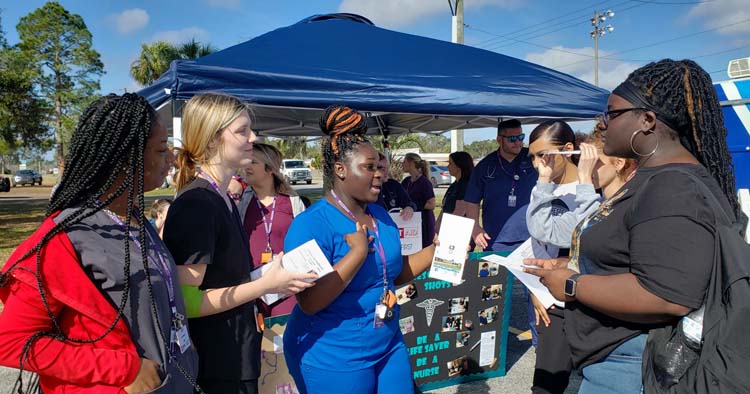 Left to Right: Kelli Morrow, Jayden Bates, and Layla Starling sharing information to students about Patient Care Technician Program. – RIVEROAK Courtesy Photo