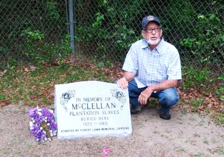 Retired archeologist Jennings Bunn sitting with the newly donated monument from Forest Lawn Memorial Gardens in Lake City. - Photo: Submitted