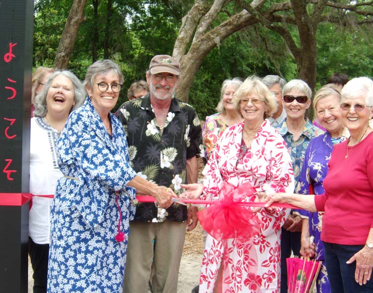 Ribbon cutting featuring Director Judee Mundy in the kimono on the left and Shirley Reaves, President of the Live Oak Garden Club on the right. They are flanked by volunteers. -Photo: Submitted