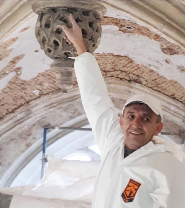 Painter pointing to the keystone where he found the matchbox while restoring the ceiling of Sint-Jacobskerk Church in Antwerp, Belgium. -Photo: City of Antwerp Courtesy Photo