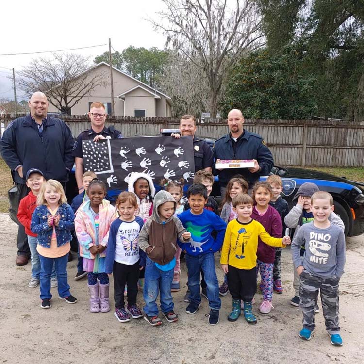 Officers L-R: Sergeant Faller, Ofc. Estevez, Sergeant Nicholson and Lieutenant Hohman hold the flag from the VPK class from Bright Stars Academy in Live Oak. -Photo Courtesy Bright Stars Academy