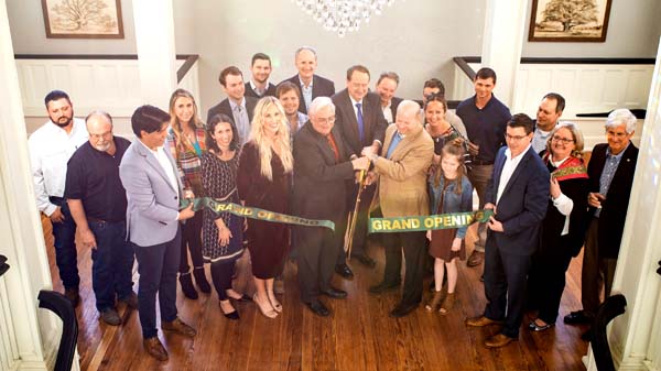 Officials, family and friends gathered at the top of the staircase as Mayor Stephen Witt, center left, along with IDP Properties president Rhett Holmes, of Valdosta, cut the ribbon during the grand opening of the newly-renovated Blanche Hotel in Lake City last week. -Photo Submitted by Dennille Decker