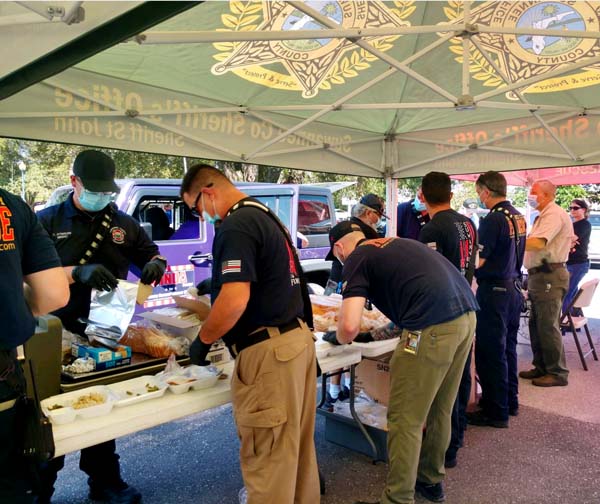 Volunteers from Suwannee County Sheriff’s Office, Suwannee County Fire Rescue and others plate up more than 450 chicken and rice dinners, last Friday, raising money to help take veterans fishing. -SCSO Courtesy Photo
