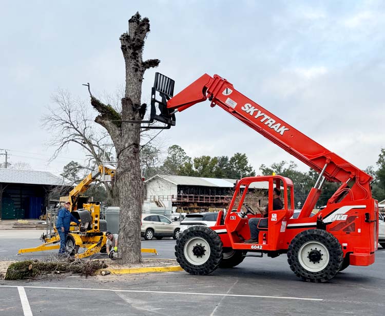 A crew cutting down the old pecan tree that stood at W.B. Howlands for the last century. -Photo by Lyn Fletcher