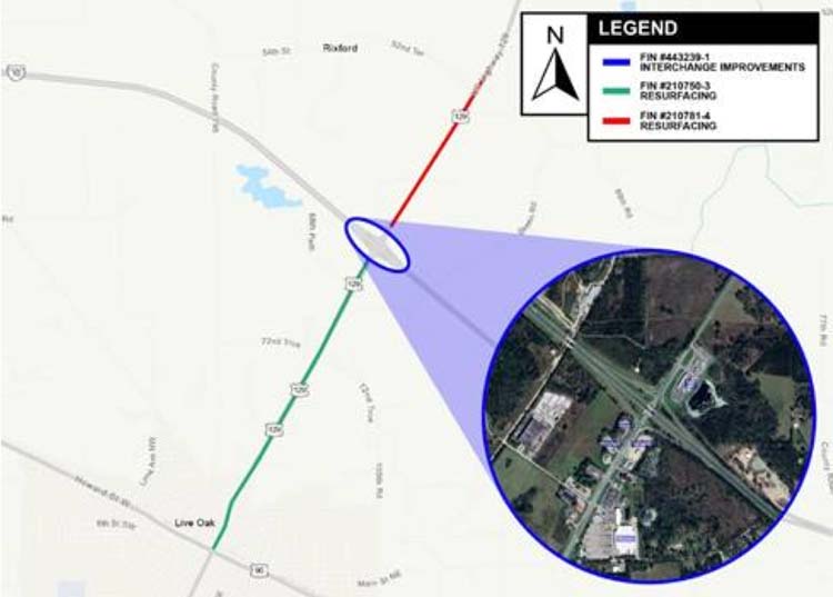 Live Oak - FDOT Resurfacing work on U.S. 129 (State Road 51) from north of U.S. 90 (State Road 10) to south of I-10 (State Road 8), and interchange operational improvements on U.S. 129 at I-10 in Suwannee County began this week.