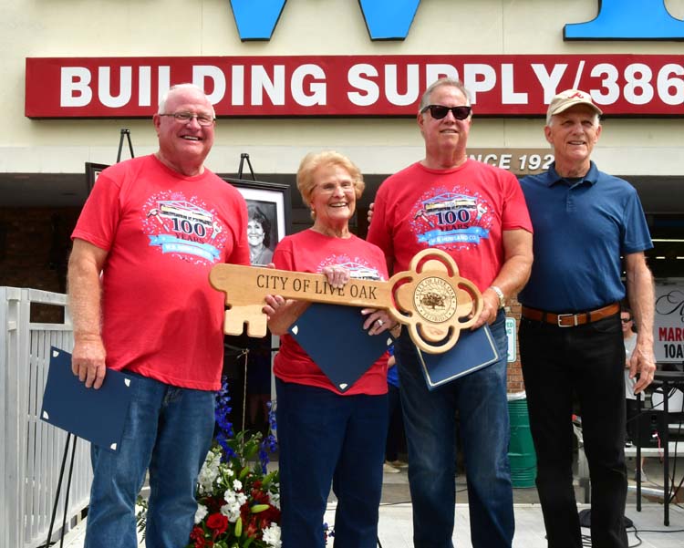 L-R: Bill Howland, Barbara Howland and Lyn Fletcher pictured earning special recognition from Mayor Frank Davis of the City of Live Oak by way of getting the “Key to the City” for their contributions to the company and community. -Photo by Rob Wolfe Photography