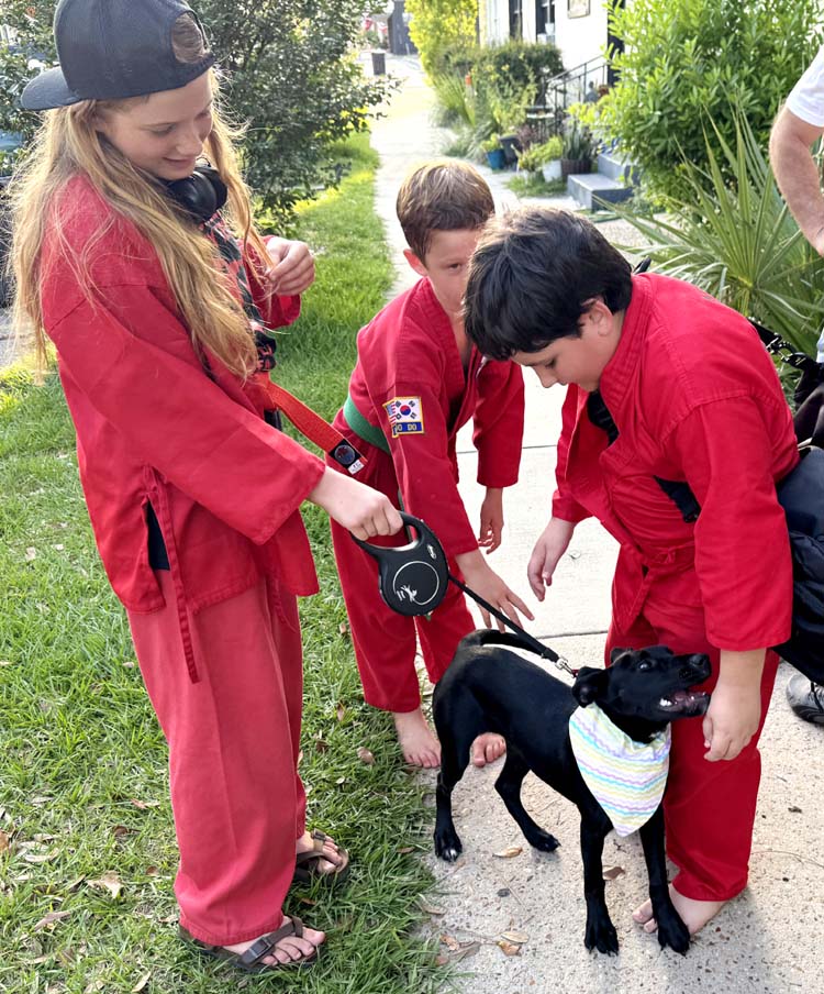 L-R: Students Avonlea Roell, Abel Roell and Jonathan (JD) Williams with Zelda, Nick Carlucci’s lab-mix puppy.