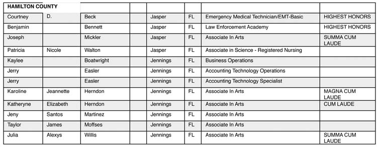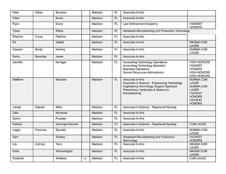 NFC is proud to recognize its Class of 2021 spring graduates and applauds their accomplishments. Thirty-five Madison County students were awarded degrees and certificates at the conclusion of NFC’s Spring Term 2021. Twenty-six Suwannee County students were awarded degrees and certificates and eleven Hamilton County students were awarded degrees and certificates.