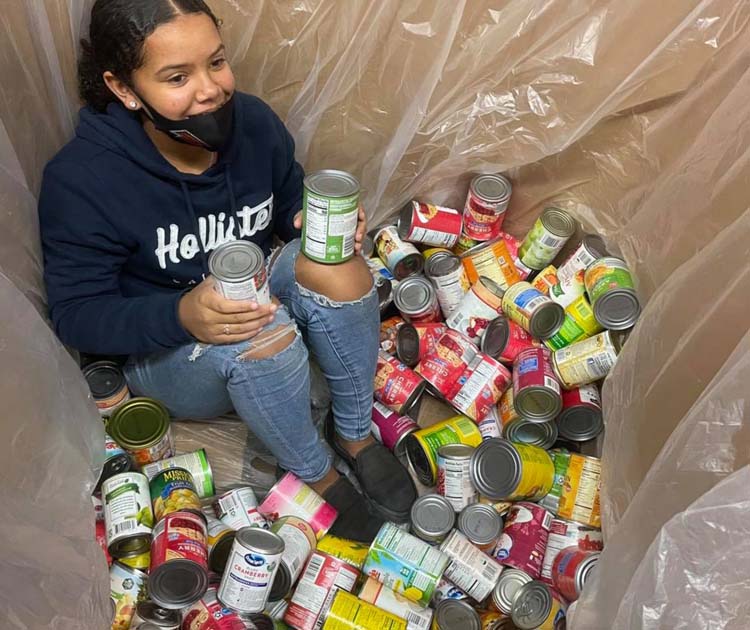 Prior to the event, food had to be sorted and re-bagged. This huge box was filled to the top with various canned goods. As student volunteers emptied the contents, it became too far for them to reach the cans towards the bottom, so Amani Tunsil, a government student from Lake City Middle School, jumped inside the huge cardboard container to fish the rest of them out. -Photo: Submitted
