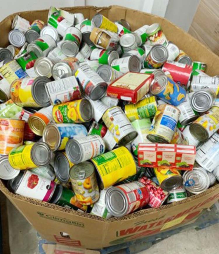 A large container of donated canned goods before sorting.