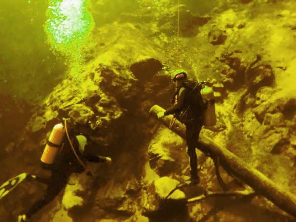 Master Dive Instructor Jim Hollis tying off to a log in Troy Springs at 50 feet down. -Photo by Dive @nikkil83
